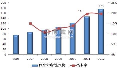 前瞻產(chǎn)業(yè)院《2013-2017年中國體外診斷行業(yè)市場需求預測與投資戰(zhàn)略規(guī)劃分析報告》數(shù)據(jù)顯示,2006年以來,國內(nèi)體外診斷產(chǎn)業(yè)以15%左右的年增長率呈現(xiàn)高速增長態(tài)勢。據(jù)統(tǒng)計,2008年我國體外診斷市場規(guī)模已達95億元,2010年增長至122億元,2011年突破140億元,到2012年,我國體外診斷市場規(guī)模約為175億元。
