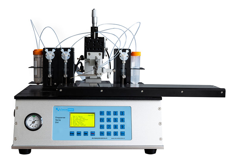 噴金標(biāo)機(jī)應(yīng)用于生產(chǎn)過(guò)程中均勻地把膠體金,熒光微球,量子點(diǎn)等顆粒均勻地噴在聚酯膜,玻纖等材料上。進(jìn)口噴筆保證線條均勻性,是中大型企業(yè)必備的生產(chǎn)設(shè)備之一。